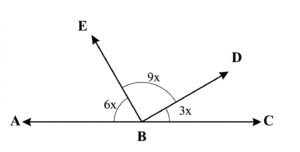 खालील दिलेल्या आकृतीतील $\angle ABE=6x,$ $\angle EBD=9x.$ $\angle DBC=3x$ तर ∠EBC किती ?